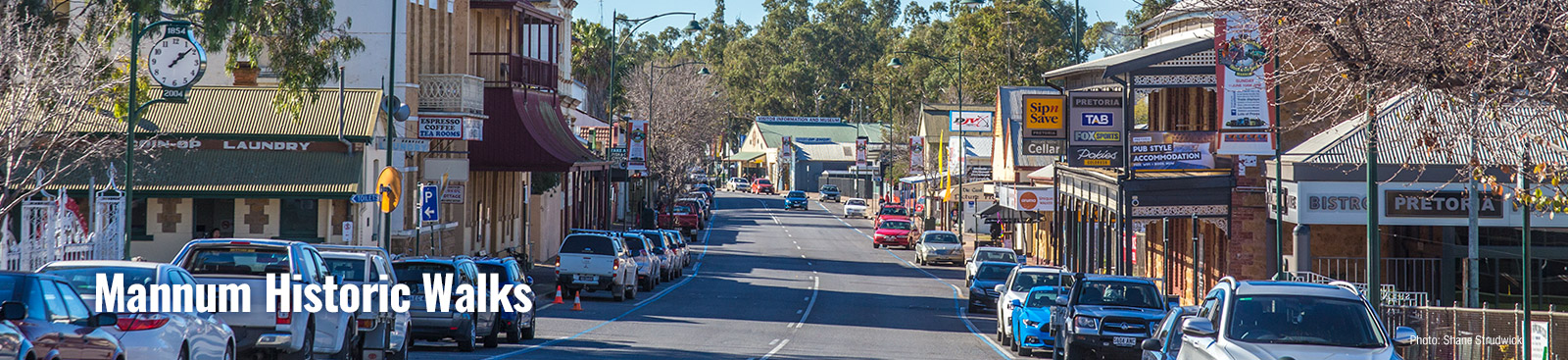 Start: The Memorial Gates, Mannum Showgrounds, North Terrace. The showground has not only hosted agricultural shows for many years, but was the accommodation base for workers on the water pipeline in the 1950s and today is used by many community and sporting groups.